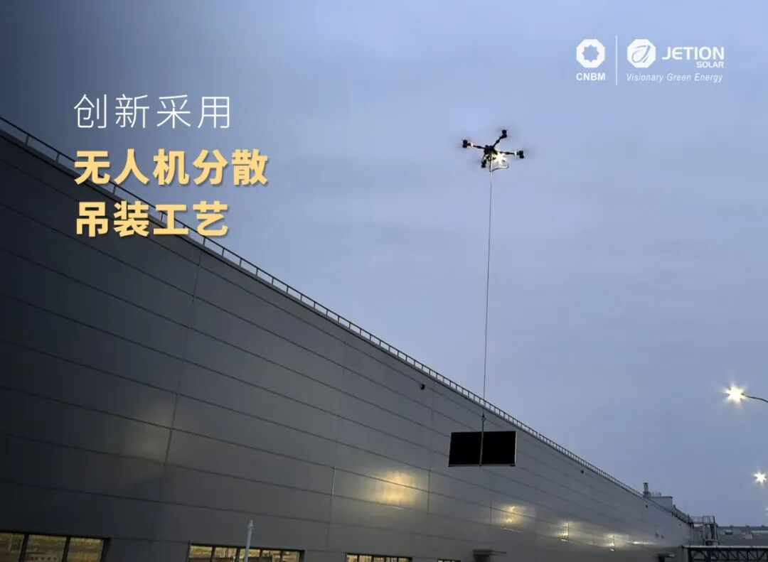 作为项目总承包方,中建材新能源工程有限公司全面负责项目从勘测设计、电网接入到施工建设及并网调试的全过程管理。面对工期紧、任务重、屋面类型复杂、厂区内物流通道繁忙等多重挑战,项目团队倒排工期、挂图作战,在确保业主正常生产不受干扰的前提下,仅用5个月便高效完成从组件进场到全容量并网的全部工作。施工过程中,团队坚持“不干扰生产、不破坏设施、不影响美观”的原则,创新采用无人机分散吊装工艺替代传统汽车吊集中作业,有效避免屋面因整托组件长时间堆放或重型设备碾压而受损;在地下集电线路敷设方面,提前与业主协同,在厂房基建阶段同步预埋光伏专用管道,对无法预留区域则采用非开挖顶管技术,确保厂区所有硬化路面零开挖、零破坏,真正实现“施工与生产两不误”。